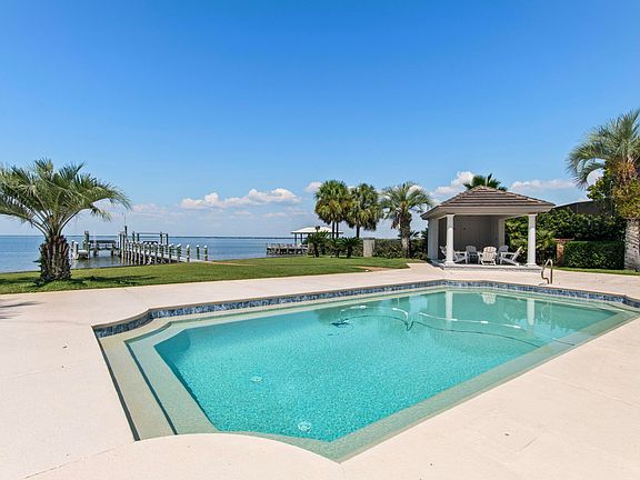 Experience luxury living on nearly an acre of prime bayfront property. This stunning estate features all new windows and doors, fresh interior and exterior paint, and a beautifully renovated kitchen designed for both style and function.Inside, a grand foyer opens to formal living and dining spaces, complemented by gleaming hardwood floors, a butler's pantry, and thoughtful details throughout. The home also boasts a private theater, spacious living areas, and double covered porches with sweeping water views.Outdoors, enjoy resort-style amenities including a sparkling pool with expansive patio, outdoor kitchen and bar, and a private dock with boat lift--perfect for embracing the coastal lifestyle.The gated drive leads to lush landscaped grounds with citrus trees and palms.