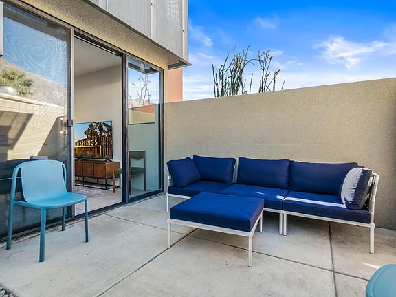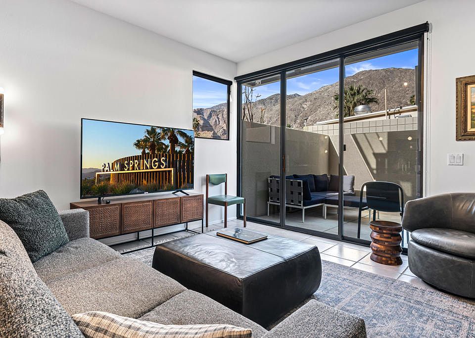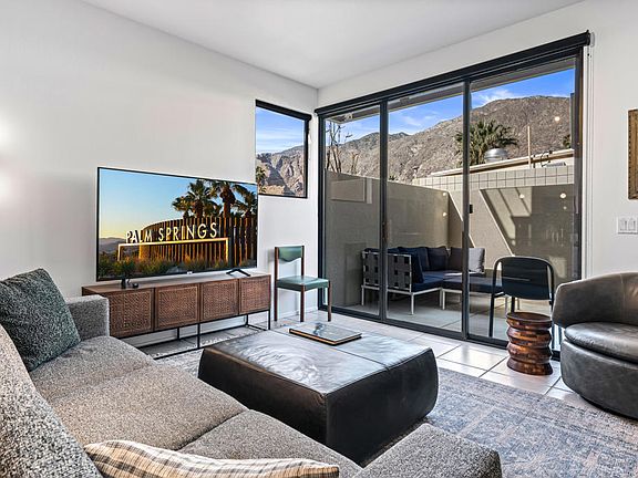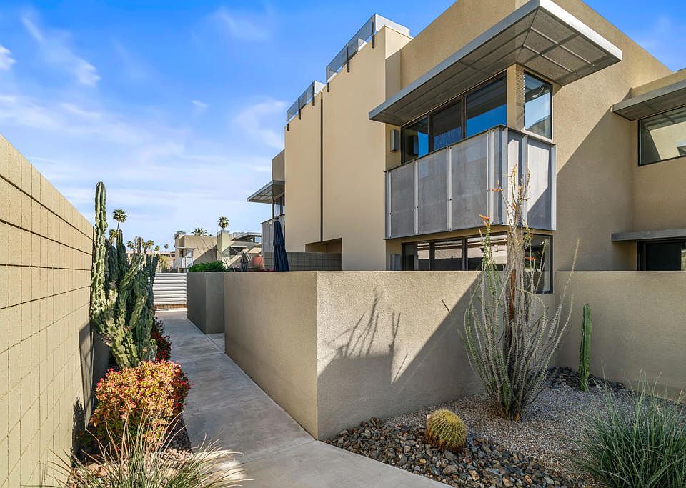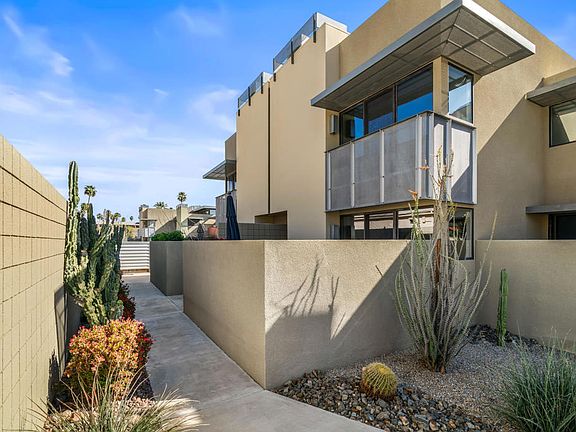 Introducing 48@Arenas - an enclave of contemporary townhouses nestled in the heart of Palm Springs, mere moments away from the vibrant Arenas District and an array of upscale dining and shopping destinations Downtown. Step into your own private oasis as you enter this sleek and modern home, where a welcoming patio sets the tone for the indoor-outdoor lifestyle that defines Palm Springs living. The main level boasts an open-concept design, seamlessly connecting the kitchen, living, and dining areas, all accentuated by expansive sliders that frame stunning mountain views and the serene Western-facing patio. A half bath and utility area round out the convenience of the main level. Upstairs, two serene ensuite bedrooms offer unparalleled privacy for both owners and guests. The primary, with its majestic mountain vistas and a charming Juliet balcony, serves as a luxurious retreat, while the cheerful morning light of the guest ensuite creates an equally inviting ambiance. Storage abounds throughout the home, complemented by a community bike room and convenient carport parking just steps away from the kitchen. Enjoy resort-style living with access to four pools and spas, all within a secure gated community where you own the land outright. Don't let this opportunity slip away!