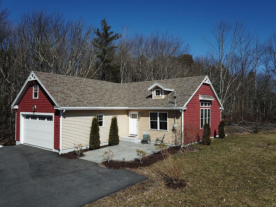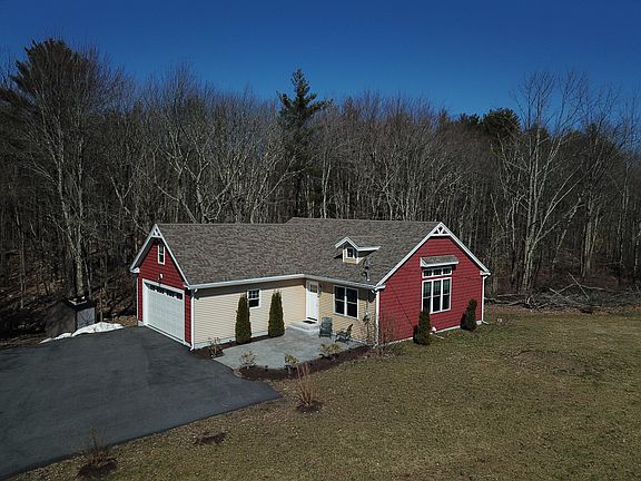 Neat as a pin, cute as a button this contemporary ranch is no cookie cutter home. The paved drive leads to a stamped concrete patio then directly into the open concept kitchen living and dining room. There you will find tall windows reaching towards the cathedral ceilings and wood beams. The kitchen amenities include Corian counter tops, bronze farmers sink and window view of the adjacent brook. Well planned cabinet space will impress you with a large pantry cabinet and oversized island with a built in mixer lift. Down the hall is a full bath which serves guests and housemates while the primary suite offers its own full bath and walk in closet. Turn towards the garage and you find even more closet space and the washer dryer hookup. Wood ceilings help set the tone in this unique home. Set back off the road we have a large front yard with acres of additional land in the back.