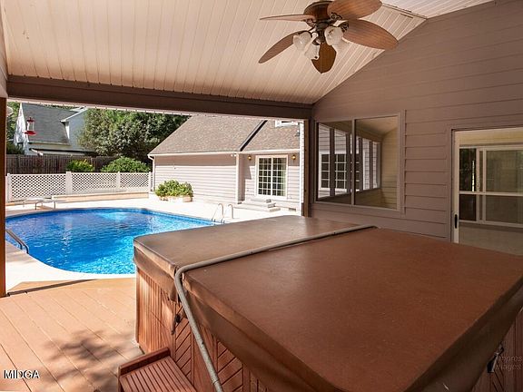 Vacation in place with this fabulous home on 1.38 acre lot with pool, hot tub under covered porch,screened back porch, fenced back yard, pool house, and plenty of living space. Main level has family room with stone fireplace, dining room, breakfast room & kitchen all with new flooring. Brand new stainless steel appliance pkg. being installed! Owners suite on main level also has stone fireplace, walk in closet private bath & new carpet. 2nd level has 3 more bedrooms - all with new carpet. 1 has it's own bonus room, 3rd upstairs room is 2nd master suite with private bath. Additional bonus room on the 3rd level.