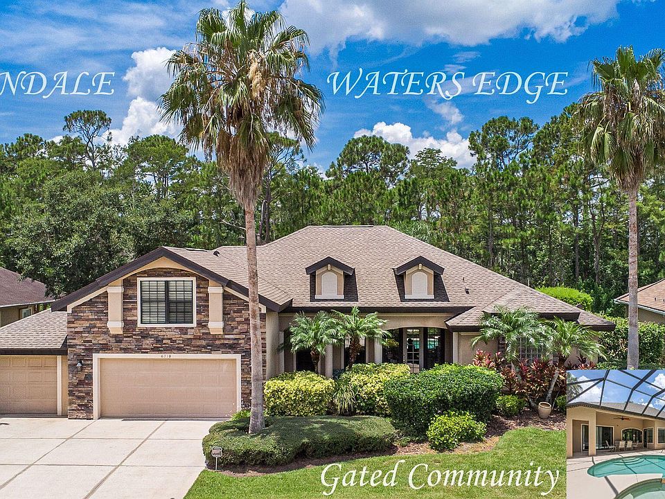 Priced to Sell!! Welcome to this stunning 5-bedroom, 3-bathroom home, perfectly situated within the desirable gated Covendale Community of Waters Edge. Built in 2004, this spacious residence offers 2,881 square feet of meticulously designed living space, ideal for families seeking comfort and convenience. Step inside to discover an inviting open floor plan in natural light, featuring 12-foot ceilings and a split floor plan for enhanced privacy. The home boasts two distinct living areas, one with a cozy fireplace, providing ample space for relaxation and entertaining. A private upstairs guest suite with its own dedicated bathroom offers a perfect retreat for visitors. Outside, a private oasis awaits with a heated pool and spa enclosed within a screen enclosure, promising year-year enjoyment. The larger 0.3-acre lot provides ample backyard space for kids to play and enjoy outdoor life. Situated on a green nature preserve, the property offers natural privacy and an outdoor feel. For added peace of mind, the home is equipped with a comprehensive security system.