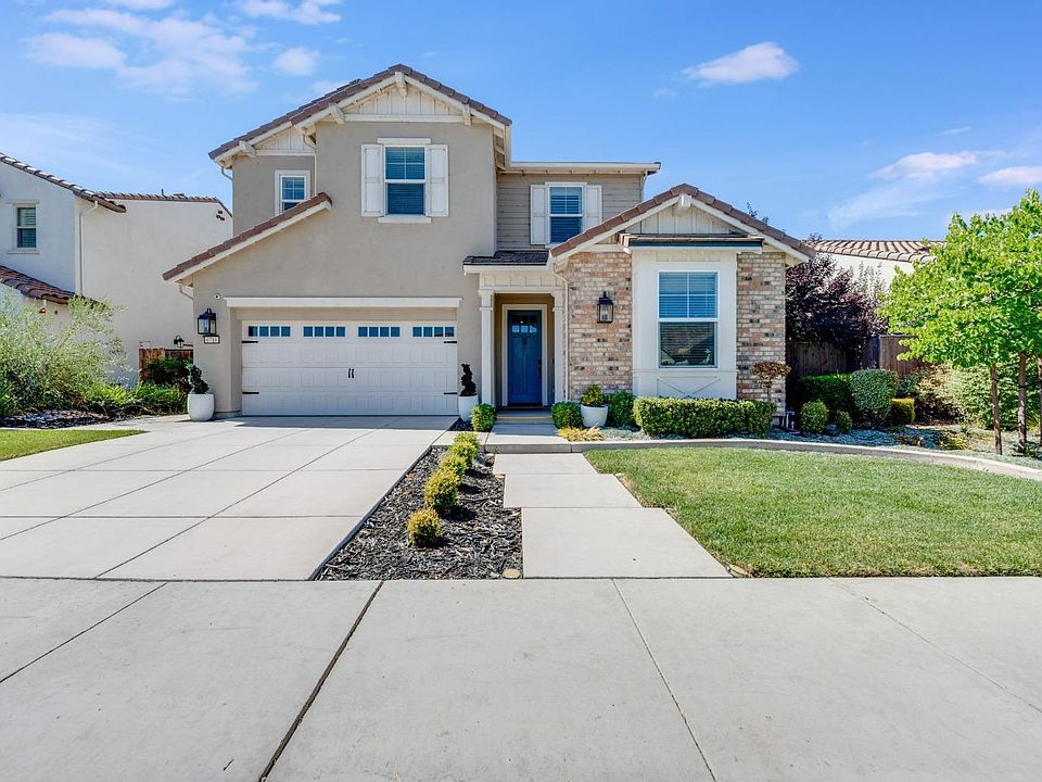 Discover modern elegance in this stunning two-story, 4-bedroom, 3-bathroom home built in 2020. Spanning 2,483 square feet on a generous lot, this home is filled with luxurious upgrades. The heart of the home is the open-concept kitchen, featuring a large island, gas cooktop, pantry cabinet, and quartz countertops that flow seamlessly into the spacious living room. Enjoy the beauty of wood floors and plush carpeting throughout. The first floor offers a bedroom and full bath, perfect for guests. The expansive master suite upstairs includes a large walk-in closet, double sinks, a soaking tub, and a shower stall. A cozy loft and a spacious laundry room with ample storage and counter space add to the home's functionality. The large two-car garage boasts epoxy floors, while the meticulously manicured front and backyards enhance curb appeal. The backyard is an entertainer's dream with a covered porch and built-in barbecue. Ideally located near parks, schools, and a golf course, this home offers both comfort and convenience.