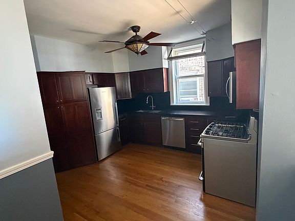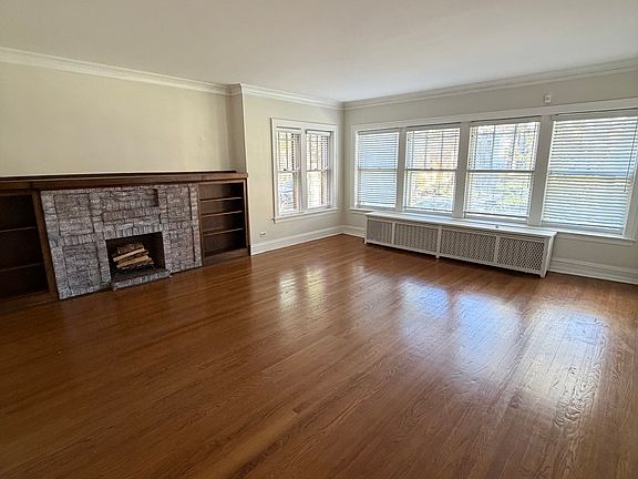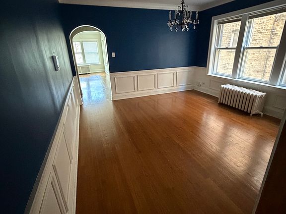 Spacious ~1,250 sq ft apartment in West Rogers Park with 3 full bedrooms plus a bonus office/sunroom perfect for remote work or extra storage. This bright unit features gleaming hardwood floors, a large living room with decorative fireplace and built-ins, and a formal dining room with beautiful trim and chandelier. The updated kitchen includes stainless steel appliances, ample cabinet space, and modern lighting. Enjoy your own private back porch, shared yard, and garage storage area.
