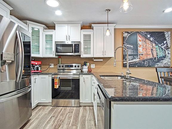 Inside, the home has been thoughtfully remodeled. The fully remodeled kitchen features new cabinets, granite counter tops and stainless steel appliances. Exposed brick accents add character and a little rustic edge.