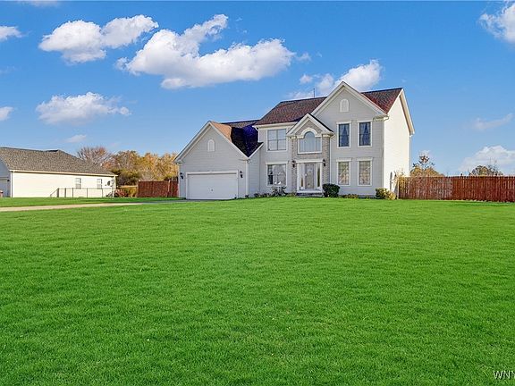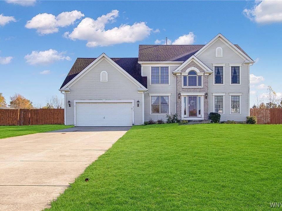 Welcome to 6713 Cortland Dr., a beautifully maintained 4-bedroom, 2.5 bath, Colonial in the highly sought-after Pendleton area within Starpoint School District! This spacious home offers over 2500 sq ft of bright, open living featuring an open concept kitchen with ample cabinetry, formal dining room, and a cozy family room with cathedral ceilings perfect for entertaining or relaxing by the fireplace. The primary bedroom features tray ceiling, walk-in-closet and ensuite bathroom with separate shower and jetted bathtub. Four-season sunroom has separate built-in heating/cooling unit which overlooks the nearly three-quarters of an acre fully fenced in backyard. Updates include: New Roof 2019, HWT 2020, new carpeting in stairwell, upstairs hall and primary bedroom. Of note, the furnace has an antibacterial light with air filtration system. The front garden has been refreshed with updated landscaping. Huge basement with workshop. And don't forget the large two-story barn/storage shed in the backyard along with the covered fenced in patio with gravel dog run and dog house.