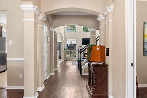 Beautiful upgrades are featured in this home located on a quiet corner cul-de-sac lot. Kitchen that features travertine tile, SS appliances w/ gas range. See the upstairs game room/2nd Living room with wet bar area and full bath. Enjoy the weather and a game of ping pong on the custom covered screened patio that spans the length of whole house! Three car garage! Newer Samsung washer and dryer included. Huge Master Bedroom and Closet. Available fully-furnished for additional cost.
