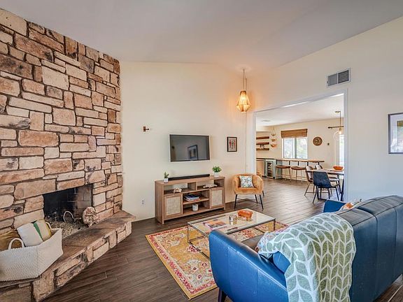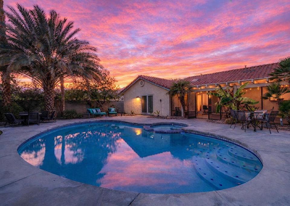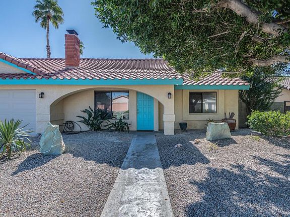 Character and charm abound in this beautiful Spanish style 3 bedroom home nestled on a private and spacious lot with mature landscaping and a sparking pool and spa! This house has a very appealing layout with high ceilings and a dramatic and gorgeous stone fireplace, Italian porcelain tile flooring throughout, Viking appliances in the large open kitchen with tons of seating to host fabulous dinner parties, outdoor BBQ's, wine by the fire, and so much more! The large and inviting primary suite with new windows and sliders gives you an amazing view of your lush new backyard and pool. The primary bedroom is completed by a huge walk in closet and an ensuite bathroom. This home has it all! It has been well maintained with upgrades like all new interior and exterior paint, drought tolerant landscape front and back, new French doors to the screened in pergola designed for al fresco dining, new dishwasher, wine cooler plus a list of upgrades to give you a sense of comfort and ease! The popular Rio Vista neighborhood is just 10 minutes from downtown Palm Springs, the airport, restaurants and shopping in Cathedral City, parks, and golf and tennis clubs are very close by as well! This stellar property is not to be missed!