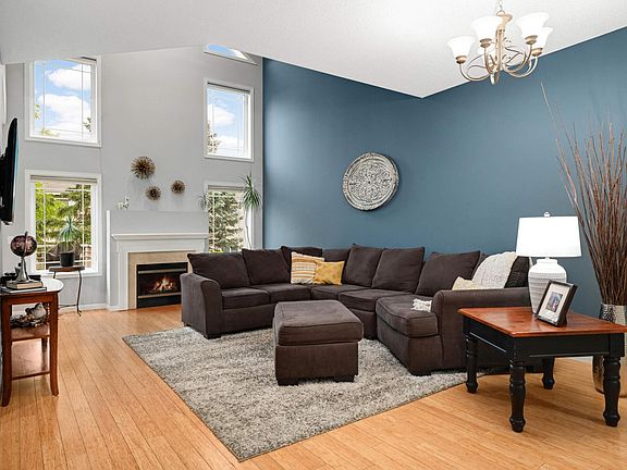 Step into this impeccably maintained, sunlit townhome offering four bedrooms and four bathrooms. The main level showcases gleaming hardwood floors and an updated kitchen complete with stainless steel appliances and a convenient breakfast bar. The open-concept living area is bathed in natural light from dramatic two-story windows and centered around a cozy gas fireplace. Upstairs, the spacious primary suite features a generous walk-in closet and a luxurious ensuite bath with dual vanities, a jetted soaking tub, and a separate shower. Two additional bedrooms, a full bath, and a laundry area complete the upper level. The lower level provides a large family room and a fourth bedroom, ideal for guests or a home office. Enjoy the nearby amenities including an association-maintained heated pool, hot tub, and playground. All within close proximity to shops, dining, and everyday conveniences.
