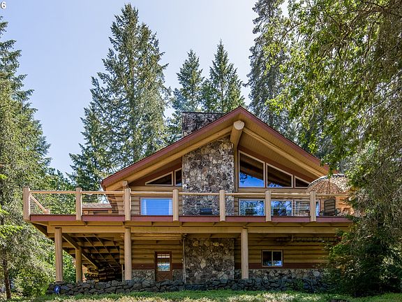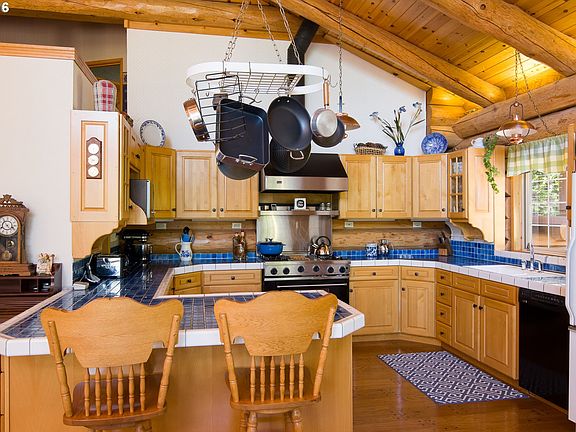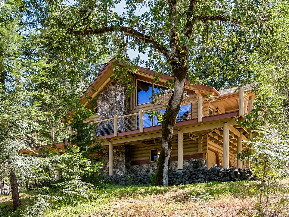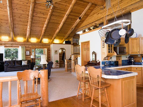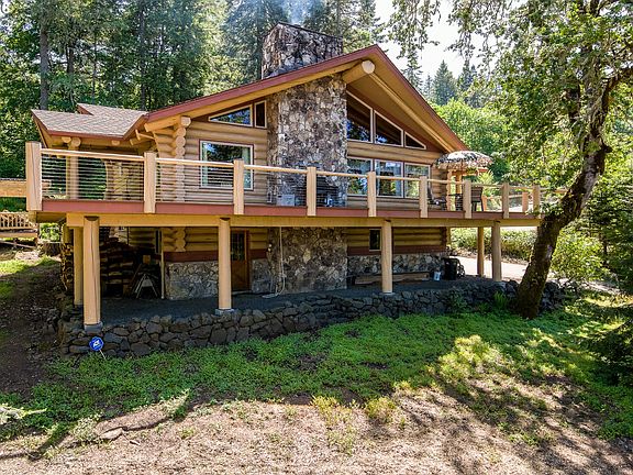 Custom split-level LOG HOME on double lot, w/city & tree views from every window. Wraparound deck. Floor to ceiling 16' stone wood/gas fireplace. Vaulted beamed ceilings, Milgard windows, solid fir doors & beautiful built-ins throughout. Kitchen features Viking stove & walk-in pantry. Master has Andersen French doors to private deck. Central vac. Oversized garage w/huge heated shop. RV parking w/hookups & dump. Rustic landscaping