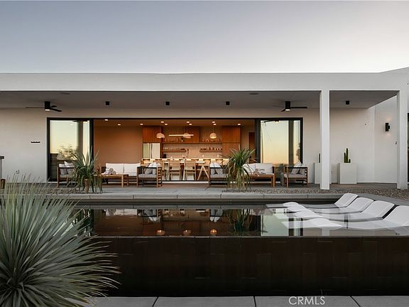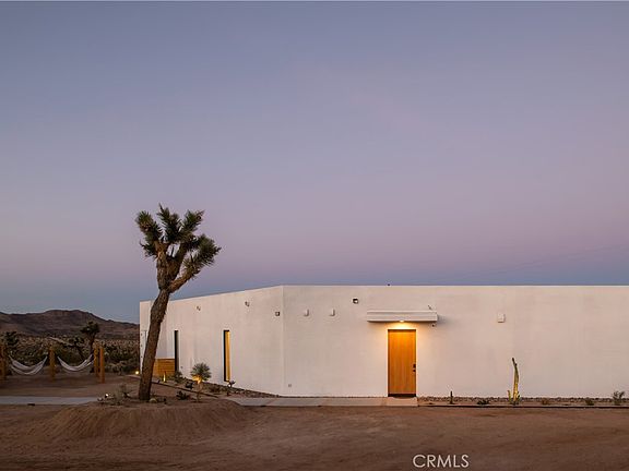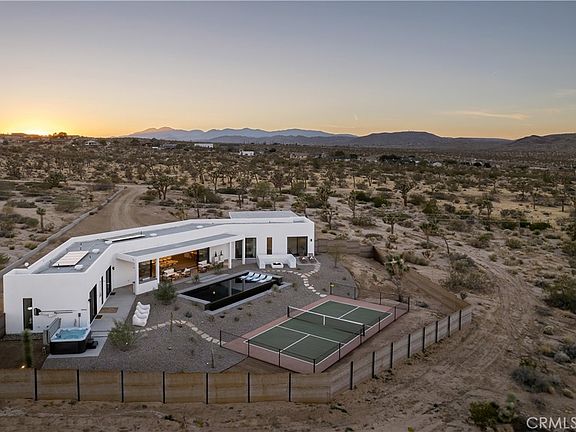 This newly constructed residence epitomizes modern architectural brilliance, nestled amidst the rugged mountainous desert scenery of Joshua Tree. This residential haven is not just a home; it's a holistic human experience designed for wellness, tranquility, and wonderment. Upon entering, you are greeted by a layout that places the kitchen at the heart of the home, flanked by two bedrooms on each side. This thoughtful design fosters balance and symmetry, creating a harmonious living space. Each bedroom, designed to emulate a private hotel suite, features its own ensuite bathroom and private glass sliding doors. This arrangement provides guests with a profound sense of privacy, relaxation, and welcoming comforts reminiscent of home. The expansive kitchen is a chef's dream, featuring an oversized island with porcelain counters, top-of-the-line appliances, and ample storage. A mini-bar area with a built-in sink and fridge adds a touch of convenience, while a 40 ft sliding glass door opens to a breathtaking panoramic mountain & desert landscape, seamlessly merging the indoor and outdoor spaces. The backyard is a sanctuary of luxury and entertainment, featuring an infinity pool with a tanning shelf, a regulation-size pickle ball court, an outdoor shower, a built-in BBQ area, a 10-person fire pit, and a hot tub. This outdoor oasis is designed for relaxation, socializing, and enjoying the beauty of nature. Modern amenities abound, including a full solar panel system, satellite wifi, EV charging, GuestView technology, smart home infrastructure, dual-stack washer & dryer, dual AC zones & thermostats for each wing of the home, dual tankless water heaters, an integrated ring security system, built-in interior & exterior Sonos speaker system, and an integrated drip irrigation system for outdoor plants, which include 35 different species. Step into an experience that transitions you seamlessly and instantly from the everyday, into a state of uncomplicated calm. Embraced by a flourishing community of artists, naturalists, and dreamers, this sanctuary harmoniously aligns with the spirit of Joshua Tree, evoking a profound sense of positive energy, creativity, and tranquility.
