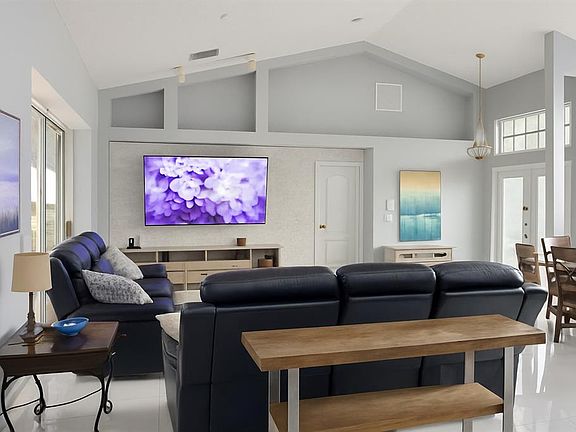 Beautifully updated home with an open-concept layout and modern finishes. The kitchen features white shaker cabinets, granite countertops, stainless steel appliances, and a large island with seating—perfect for entertaining. Enjoy vaulted ceilings, recessed lighting, and glossy porcelain tile floors throughout. The living area includes a custom stone accent wall with a built-in media space. Bright and airy with a neutral palette, this home blends comfort and style. Conveniently located near beaches, shopping, and dining. Den can be used as a 4th bedroom!