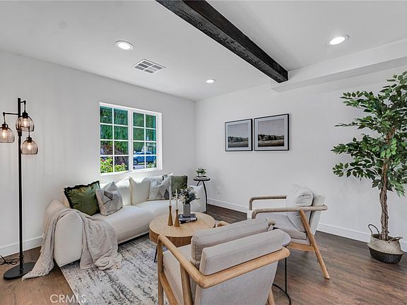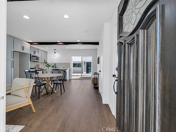 The front unit is the ADU. Newly built, the downstairs has a beautiful powder room with a comfy living room dining area and kitchen equipped with range, microwave and dishwasher. Upstairs are 2 bedrooms, each with its own bathroom and hook ups for stackable laundry.