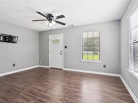 Private pondOpen concept floorplanWhite shaker cabinetsGranite countertopsStainless-steel appliancesMature trees