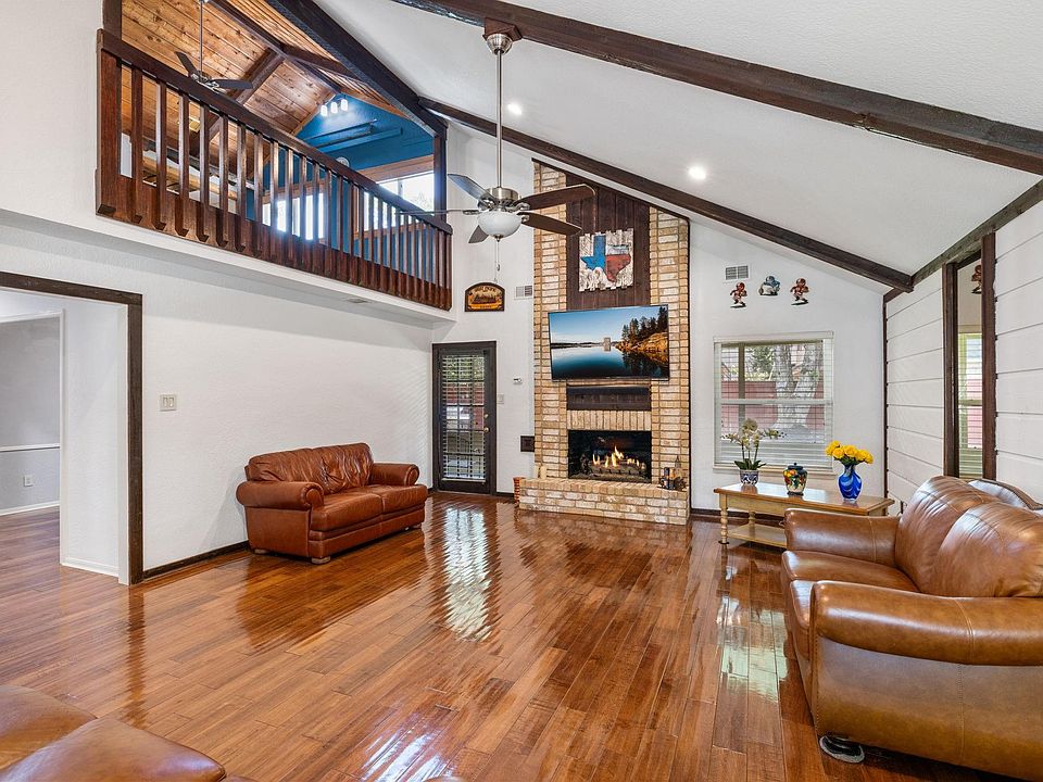 Beautiful 4 bedroom, 2.5 bath custom home in Champions Park Subdivision. Spectacular contemporary elevation with cedar garage door and beautifully landscaped front yard. This home makes a great first impression. Beautifully updated kitchen with granite counters, tumbled tile backsplash, stainless appliances, a breakfast bar & butlers pantry. The den/family room is stunning with a floor-to-ceiling gas log fireplace, beautiful hardwood floors, vaulted-beamed ceiling and a painted cedar accent wall. Large primary with gorgeous wood floors, and a beautifully updated bath that features granite counters, dual sinks, jetted tub & shower. You will love the rustic upstairs game room with vaulted cedar ceiling and a large wet bar. Gorgeous wood flooring in entry, den, dining & primary. The screened patio across the entire back of house is a great place to relax. Steel roof with remaining 20 yr warranty. Hardy siding-nice added feature. HVAC replaced in 2025/Water heater replaced in 2023.