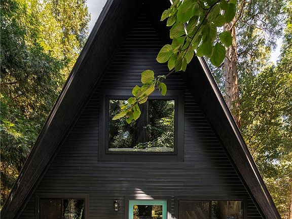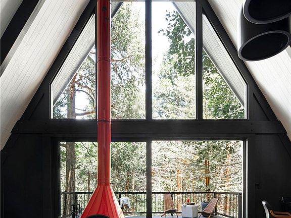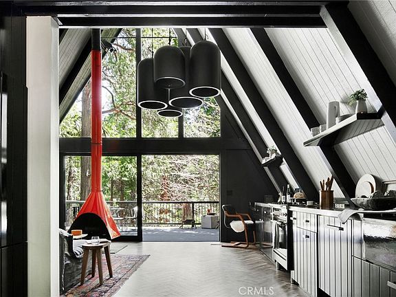 Black Oak A-Frame is tucked away on a canopied street in the quaint mountain town of Crestline, California. Surrounded by mature trees and set back from the road, this mountain gem has been restored and updated with no detail spared. Enter via a pathway flanked by the mountains natural landscape into a room of towering windows, the original mid-century fireplace and dual sliding Fleetwood doors. A chefs kitchen adorned with custom cabinetry and an Italian range opens to a main living space that exudes moody vibes and expansive views of only trees. You will also find a coffee bar and intimate dining space with direct access to one of the two outdoor living areas. The spa-like bathroom on the main floor is modernized with floor to ceiling tile and a floating tub with views of the Dog Wood trees. Retreat to the lofted bedroom that frames unobstructed views of floor to ceiling windows. Each of the spacious outdoor decks is a special place to enjoy the unparalleled nature around the home. This special cabin is located in close proximity to Lake Gregory and only 70 miles from L.A.’s east side neighborhoods.