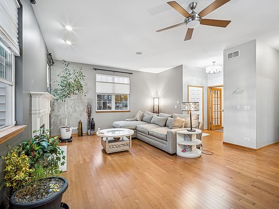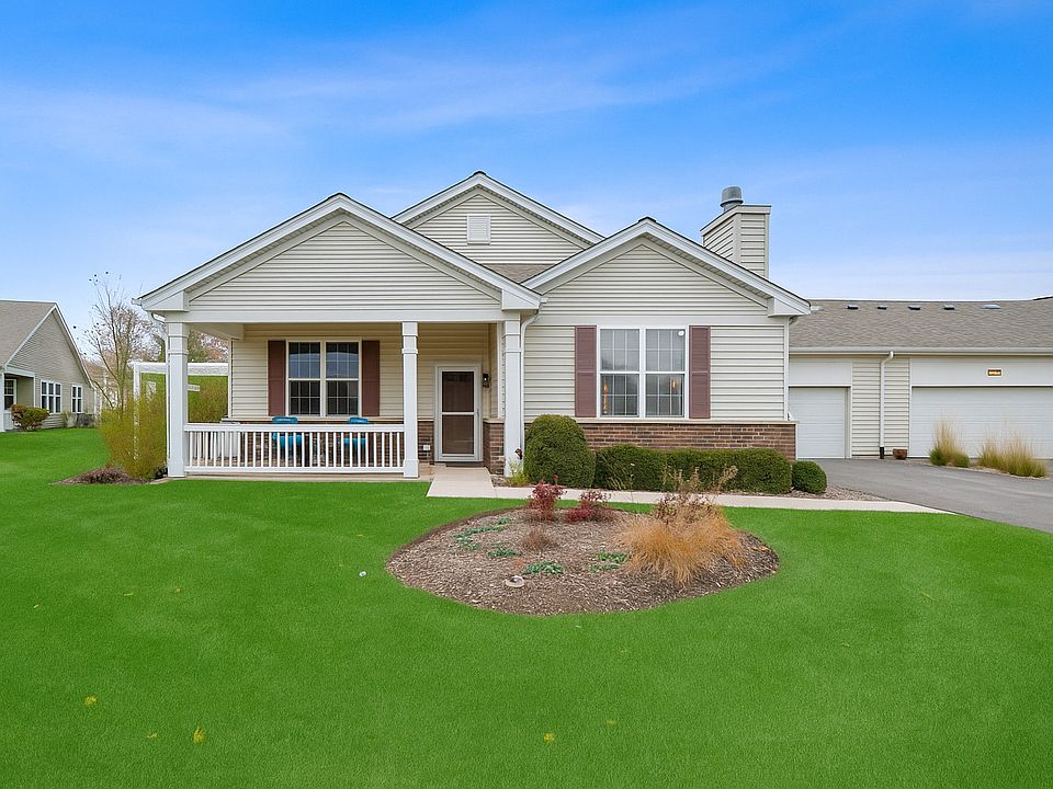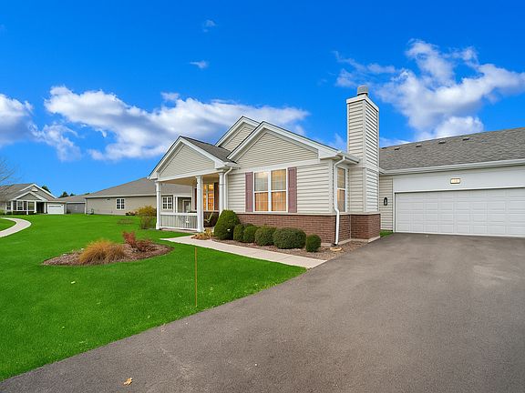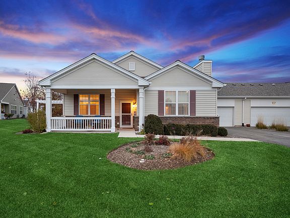 Welcome to 672 Falls Drive - where resort-style living meets everyday comfort! Tucked inside the highly sought-after Carillon at Cambridge Lakes, this beautifully upgraded quad ranch townhome sits in one of Pingree Grove's premier 55+ active adult communities. Carillon is more than just a neighborhood - it's a lifestyle. Enjoy the clubhouse, indoor and outdoor pools, fitness center, walking and biking trails, tennis and pickleball courts, and even a 3-hole golf course. Join social clubs, take classes, or just meet your neighbors for happy hour at the clubhouse bar - it's all right here. A welcoming front porch and brick accents enhance the curb appeal as you pull up. Step into an open-concept layout made for easy living and effortless entertaining. The chef's kitchen is pure eye candy - with sharp white cabinetry, sparkling quartz countertops, stainless steel appliances, glass tile backsplash, and a breakfast bar that's perfect for morning coffee or wine with friends. The spacious living room features a cozy gas fireplace that sets the perfect tone for movie nights or quiet evenings in. You'll love the split-bedroom layout for extra privacy. The vaulted primary suite delivers a peaceful retreat with a walk-in closet and plenty of space to unwind. The second bedroom doubles beautifully as a guest room, office, or fitness space, featuring French doors and a slider that open to your private patio and pergola - the ideal spot for a good book and fresh air. Throughout the home, you'll find gleaming hardwood floors, upgraded lighting, and a built-in speaker system for that "whole-home concert" feel. Everything here says "move right in" - and then get out and enjoy everything this community offers!! And when you do venture out, you're minutes from Routes 47/72/20, with quick access to I-90 and Randall Road shopping, dining, and entertainment. Grab brunch at Old Republic in Elgin, explore the Pingree Grove Forest Preserve, or take a quick drive to Downtown Huntley's farmers market or festivals. This is the kind of place where every day feels like a getaway - and this townhome makes it effortless to enjoy it all. Come see why Carillon at Cambridge Lakes isn't just where you live - it's how you live.