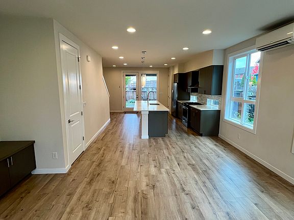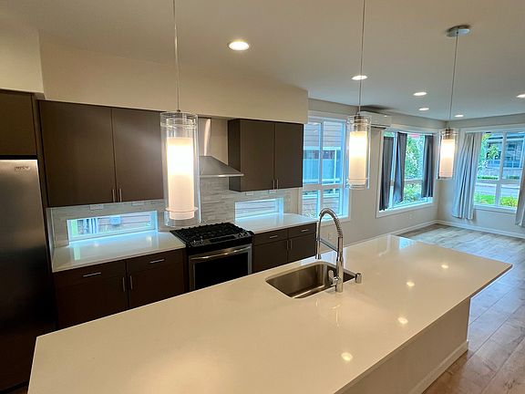 The property has a spacious living room and a large kitchen island with generous storage. There is a gas cooktop, oven, and built in dishwasher and microwave. The backyard is fenced with turf grass and has a covered patio with a built in space heater. There are two parking spots in the alley as well.