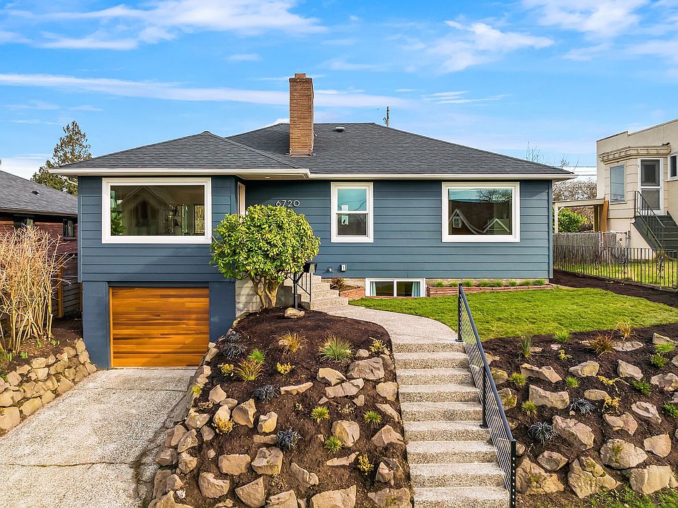 Designer re-envisioned mid-mod bungalow in the heart West Seattle! Step inside to warm and inviting spaces, gorgeous finishes & the perfect floor plan. Sweeping views of the Puget sound & Olympic mountains from the large picture window in the open concept living room. Easy flow from living to dining room to new eat-in kitchen w/shaker cabinets, quartz countertops, subway tile backsplash, tile floor+ stainless appliances. 3 bedrooms up + fully remodeled main floor bath: new floating cabinetry, playful tile flooring, vertical subway tile sub surround, and 1/2 glass tub enclosure. Studs out reno of lower level: reconfigured layout featuring bonus room, bedroom, darling new ¾ bath + new kitchenette + stacking W/D. Fresh paint in/out + designer lighting throughout. New plumbing, electrical, vinyl windows, trim, heat pump, water heater, deck, vinyl siding, roof, front door, garage door and MORE! Entertaining size back deck overlooking large level fully fenced backyard with Space Needle view. Plenty of room for future dream landscaping, garage or DADU. Just blocks to Myrtle Reservoir and Watton Pocket park: a secret gem that many locals use for sunset viewing or dog runs! This one is special!