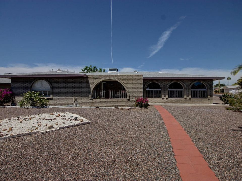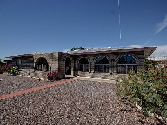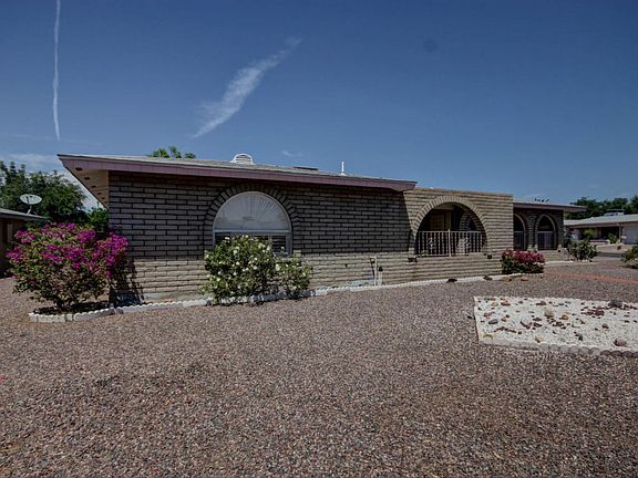 This house boasts a huge corner lot with low maintenance desert landscape front and back. The spacious living/dining room has a classic kiva fireplace. Kitchen opens to the dining area and has plenty of counter space and storage. Master suite has lovely arched window with plantation shutters and a walk-in closet. The enclosed family room borders a curved patio surrounded by mature fruit trees.