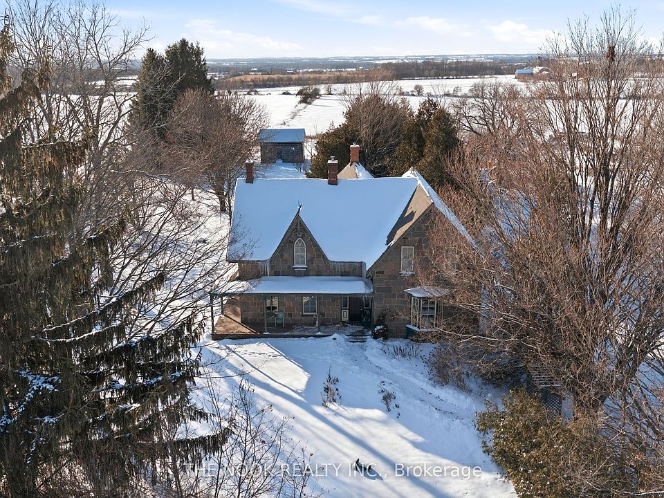 A "One of a Kind" 80 Acre Jewel! Welcome to the historic "Floradale" Stone Farm House circa 1865 built for John Galbraith & Flora MacConnachie of Scotland who were importers & breeders of Clydesdale horses. Designated as a property of historic/architectural value or interest under the Ontario Heritage Act, this home was identified as one of the earliest fine stone houses in the region. What a grand 3600 SqFt Stone home with architectural features: a traditional centre hall plan yet unique with a t-shape exterior at the back of the home, the wrap around verandah & gingerbread trim on the south wing, the Cross & Bible front door with its rectangular sidelights & three part transom, the original stone voussoirs and on the inside, the wood trim, wide plank pine flrs, casings around the 18" window recesses, the kitchens 8 original doors & 4' high wainscoting & more. This 4 bdrm home has many practical features: generous closet space, upper level laundry room, a mnflr powder rm, a large upper bathroom. Beautiful details welcome you: the spacious foyer, 10' ceilings, the centre hall staircase with beautiful handrail & rosette detail resting on the unpainted,wooden newel post. The very large diningroom features stunning plaster details at the centre ceiling plus lovely cornices around the room. The kitchen is the heart of this home w/ a woodstove, private back staircase, granite countertops, large walk in pantry w/o to yard & to south west facing stunning verandah. This 80 acre property has approx 45 acres of farmed land, your own enchanted forest area, a pond, a log cabin "shed", foundation portions of the original barn, perennial gardens & more. So peaceful with few homes on this paved road, great for cyclists and runners, just 2 min drive to Hwy 115 w/ access to the 401& 407 for commuters; this is country, yet the nearby urban amenities of Historic Downtown Bowmanville & Newcastle as well as country living experience of nearby Brimacombe ski hill & Ganaraska Forest.