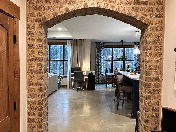 Separate showerViews of the woodsPantry with extra storageSide by side fridgeLarge closetSpacious kitchenBrick archway