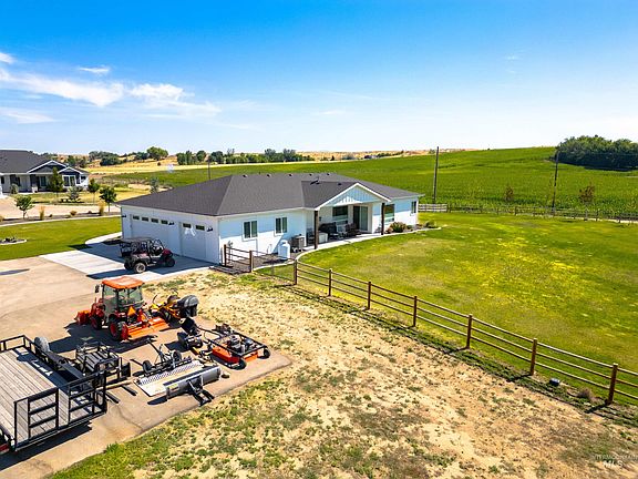 This upgraded single-level home sits on 5.02 agricultural-zoned acres (meets the threshold to maintain a permanent exemption) in the rolling hills of North Middleton/Caldwell. Located in a newer community with private trails to BLM land, the property allows for a second home—stick-built or manufactured—with water and electricity already pulled to the back. Enjoy an open floor plan with quartz/granite countertops, a fireplace, LVP flooring, and tile bathrooms. The spacious kitchen flows into the great room. The primary suite has a custom walk-in closet, large shower, and soaker tub. Take in mountain and valley views from the covered patio. Horse-ready with pasture shelter, feed room, round pen, and arena. Full RV pedestal with water, electric, and septic. Pressurized irrigation with negotiable irrigation pods. Additional features include large laundry with sink, sprinkler system, storage shed, and security system. See upgrades list to see over $20,000 worth of upgrades!