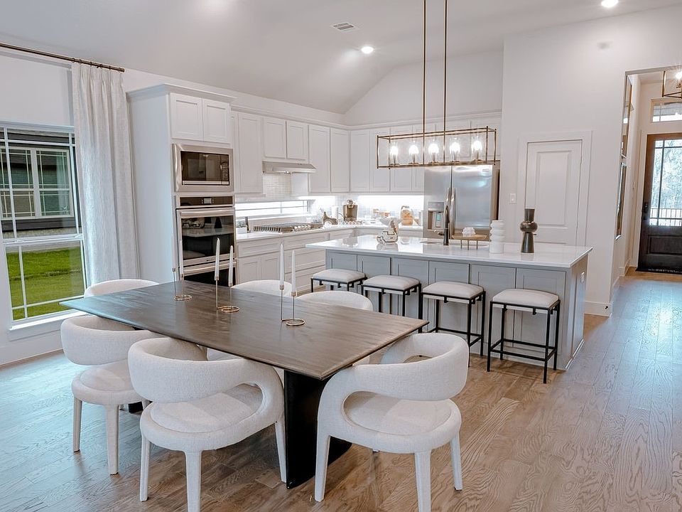 Cozy fireplaceStainless steel appliancesDining areaLarge windowsGranite countertopsNatural lightModern kitchen