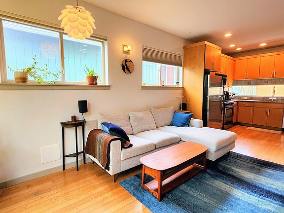 Welcome to your cozy Ballard oasis! This 2 bedroom/1.5 bath stand alone home features expansive western facing windows, contemporary stylings, and functional design. Enjoy the rare combination of quite privacy with under 5-minute walking access to Whittier's best restaurants and shops! Tucked offset from street, this home features an open floor plan main living level, fenced in private back yard, modern appliances, and an expansive 200+ sq ft. garage perfect for hobby/work out space, gear storage, etc. Tri-level floor plan, with lower-level tiled entry foyer and garage, mid-level kitchen, living, dining, and bathroom, and third-level primary bedroom with floor to ceiling windows, secondary bedroom, primary bathroom with beautiful tiled shower and full bathtub, and washer/dryer. Stone counter tops throughout kitchen and bath, bright hardwood living level flooring, and recently replaced carpeting in bedrooms. Natural gas range/stove and new tankless hot water heater, cozy hydronic heating, and built in wall ports for included portable AC units. Come and experience this cozy, private, and modern sanctuary, designed to cater to all your lifestyle needs. Your perfect rental home awaits! 12 month lease. Available week of March 24. First/last/deposit due before move-in. Tenant must be in good credit standing. No smoking or pets permitted. Tenant responsible for all utilities. Owner will cover bamboo maintenance service, tenant responsible for other yard management.