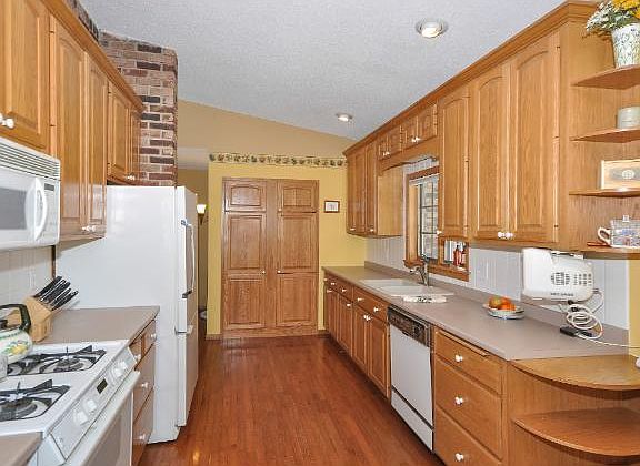 The kitchen showcases hardwood floors, an abundance of amazing cabinetry, plenty of counter space and built-in shelving. A wonderful bright kitchen with recessed lighting and a unique wall of brick adds to the beauty. The informal dining area offers a large window with serene views of pine trees.