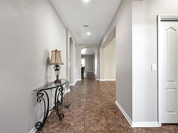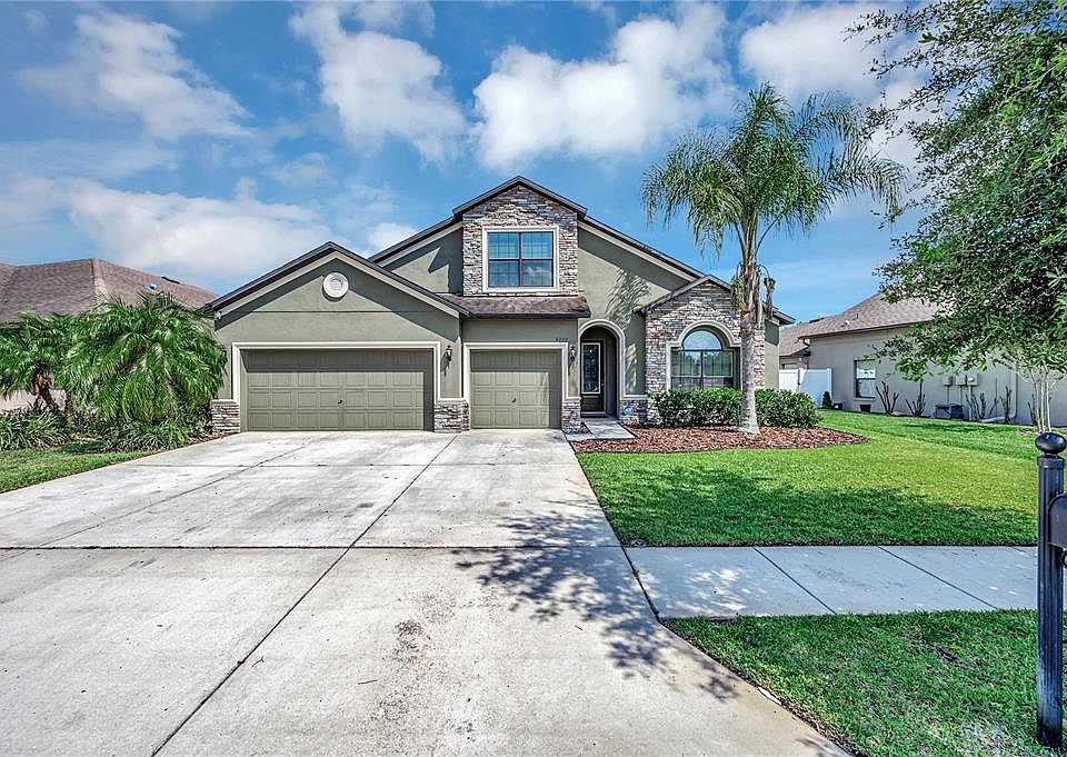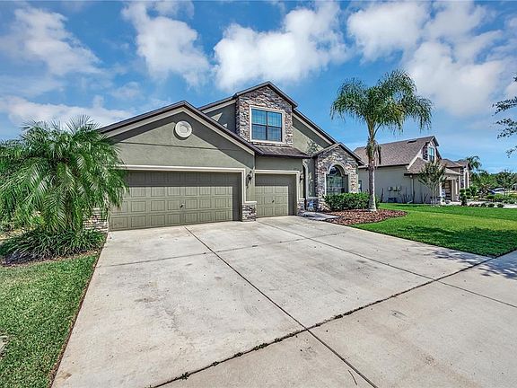 Welcome to this Stunning Oak Creek Home with Premium Water Views. Spacious 5-bedroom, 3-bathroom home with a 3-car garage, perfectly situated on a premium lot with tranquil water views of the pond and no direct rear neighbors. Thoughtfully designed open living space featuring high ceilings with beautiful arched entryways, and enjoyable direct water views through the large patio doors, overlooking the serene pond. The first floor comes with easy-to-maintain tile flooring throughout the living spaces and wood laminate flooring in the bedrooms. The large primary bedroom suite overlooks the pond and boasts double walk-in closets, a whirlpool bath, walk-in shower, water closet, and double vanities. Super functional split floor plan offers privacy with three additional bedrooms on the first floor and a 5th bedroom or bonus room on the second floor. The open concept kitchen features elegant 42" wood cabinetry, stainless steel appliances including a wine fridge and new LG French doors refrigerator and new microwave, a large eat-in peninsula space, and a spacious walk-in pantry. One of the bedrooms is in the front features a beautify tray ceiling and could be setup as a home office. The covered Lanai / Patio / Back porch has access to the third bathroom. This amazing home also features a water softener, sprinkler system, and two separate HVAC systems, one for each floor. The very low HOA fee offers many benefits, including: a saltwater pool, covered playground with swings, basketball/pickleball court, picnic pavilions, walking trails, and a great dog park! This a truly a great location with easy access to shopping, dining, great schools, minutes from I-75. Come see it today before it is sold.