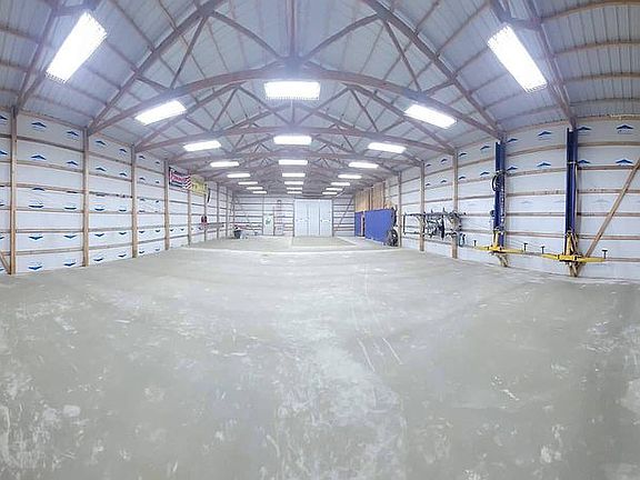 There is a 3 car garage, attached to an office, then attached to a 40'x70' pole barn with a poured floor.