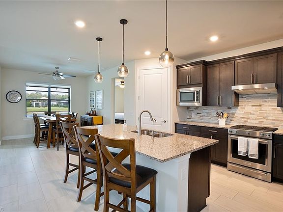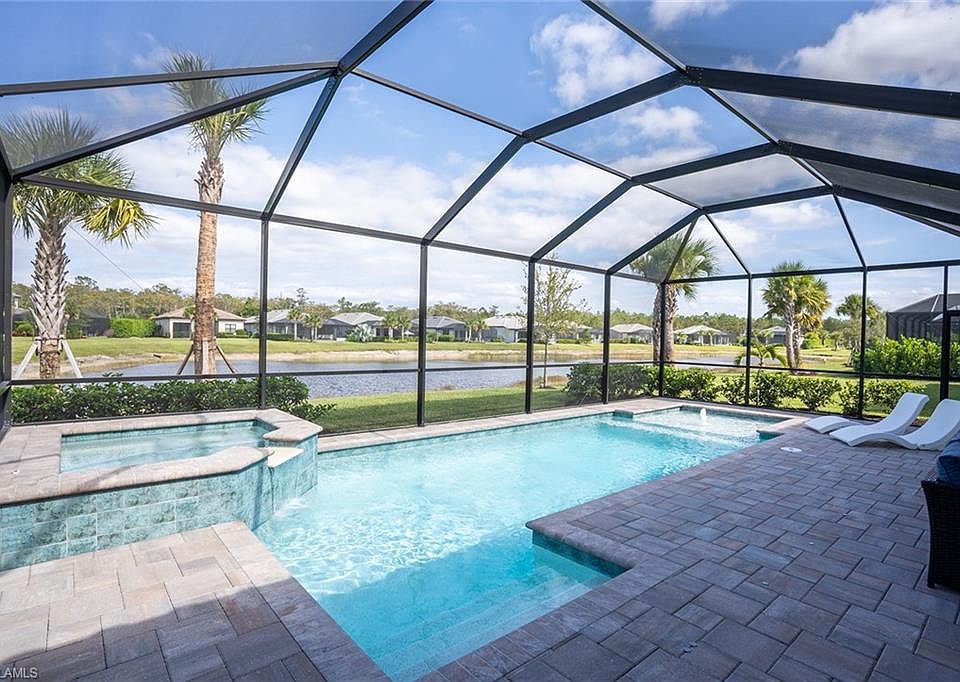 Welcome to this single-family home, a mere 2 years old, offering a slice of paradise. The popular Mystique floor plan boasts almost 2,100 sq ft of indoor living space, with 3 bedrooms, a den, and two bathrooms. Additionally, you'll find a sprawling spectacular outdoor living area, featuring a Saltwater custom pool and spa, complete with a sun shelf and water feature, and a picturesque water view from the screened-in extended lanai and patio. The zero corner sliding doors seamlessly blend the indoor and outdoor living spaces. This home is loaded with upgrades, including tile and carpet flooring, an extended and epoxied garage, overhead lighting & ceiling fans throughout, custom blinds, upgraded appliances, and a Kinetico water filtration system. Perfectly situated in the VERY DESIRABLE COMMUNITY of WINDING CYPRESS, you'll be conveniently close to 5th Avenue, Marco Island, I-75, shopping, dining, beaches, and entertainment. However, there's little reason to venture far, as Winding Cypress offers a dream-like lifestyle with its resort amenity campus. You can revel in the delights of a resort-style pool and spa, restaurant, yoga lawn, outdoor fireplace, tennis or pickleball, state-of-the-art fitness center and exercise studios, and more. This property is offered turnkey furnished, waiting for your personal touches to make it your own. Simply pack your bags and move in to start living the Florida dream.