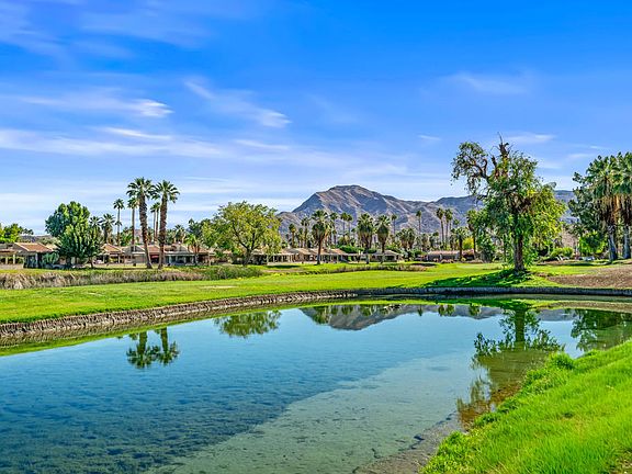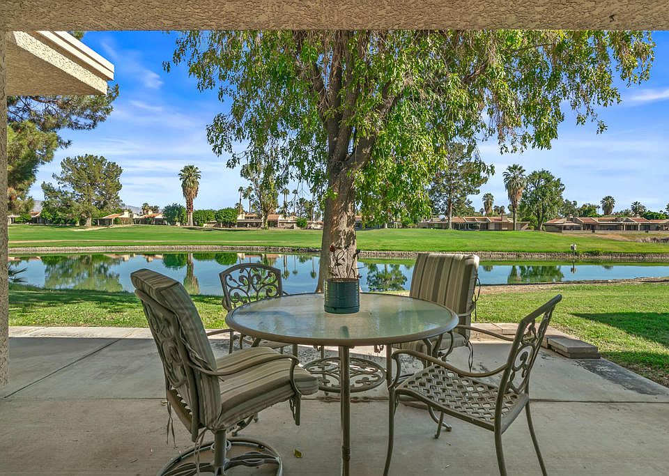 Set against a tranquil waterfront and lush fairways of Cathedral Canyon CC, this open-concept south Palm Springs residence captures the essence of relaxed desert living. Vaulted ceilings and clerestory windows fill the open living space in natural light, highlighting generous proportions and a seamless connection to the outdoors. East-facing patios overlook the lake, fairway, and distant Santa Rosa Mountains, while a private courtyard enjoys peek-a-boo western views. The inviting living area features a classic sunken bar, ideal for entertaining. The kitchen features modern countertops and a functional layout. The primary suite opens to the lakeside terrace and offers a spacious bath with separate tub, shower, and water closet. A guest suite with courtyard access provides comfort and privacy for visitors. The property also includes an in-unit laundry, a large two-car garage, and close proximity to one of several community pools and spas. Cathedral Canyon CC surrounds an 18-hole championship golf course designed for a resort-style lifestyle in one of Palm Springs' most established gated communities. Furnshings are negotiable.
