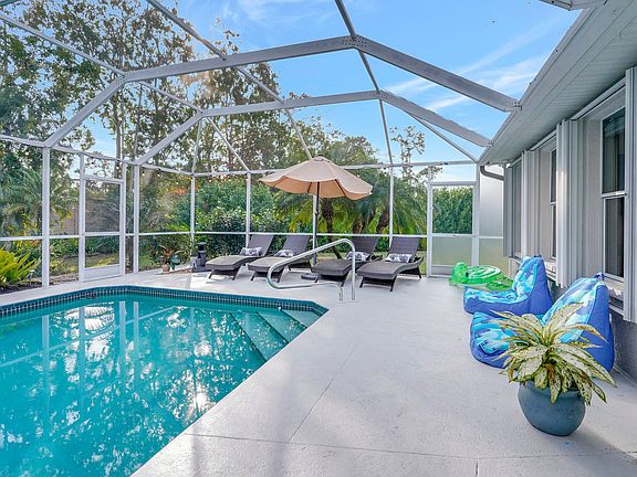 Welcome to your vibrant Naples retreat! Situated in the charming Berkshire Lakes neighborhood, this delightful pool home at the end of a serene cul-de-sac is your ticket to an unforgettable short-term stay. The pool and pool deck face south. Dive into fun with the heated pool and complimentary beach gear, including two brand new bikes for exploring the area's treasures. The main bedroom features a king-size bed along with a sprawling en-suite bathroom with direct access to the pool. The second bedroom, which faces the front of the home, features a queen bed. Lastly, the third bedroom, a converted den, is centrally located within the floor plan and has a queen bed with a trundle that pulls out from underneath. Inside, you'll find a variety of dining spots: pull up a seat at the kitchen counter with its bar chairs and four-top dining set, or gather around the dining room table, which comfortably accommodates six. Prefer to dine outdoors? There's a spacious outdoor set-up with a six-seater round table under the roof, and for a laid-back vibe, relax on the poolside chaise loungers.