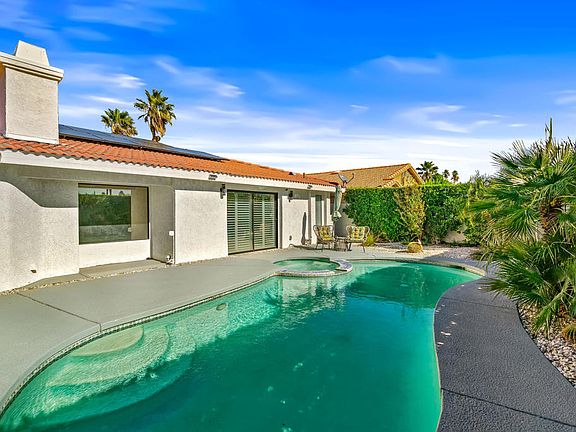 This 3 bedroom, 2 bath, 1,766 sq ft single story home has been extensively updated in recent years. Located on a 7,405 sq ft lot, the property sits on fee land (no land lease) within the quiet and well kept Rio Vista community. Interior Highlights-Open‑concept layout with vaulted ceilings and abundant natural light-Sunken great room featuring a dramatic floor‑to‑ceiling stacked‑stone fireplace--a standout architectural feature-Tile flooring and plantation shutters throughout for a clean, modern look-Custom built‑ins and a wet bar, ideal for entertaining-Updated kitchen with: Stainless steel appliances, Garden window, Glass tile backsplash, New cabinetry, Breakfast nook overlooking the yard-Dedicated laundry roomOutdoor LivingDesigned for year‑round enjoyment, the backyard is a true highlight:-In‑ground pool and private spa--your own desert oasis-Covered and open trellis patios, perfect for al fresco dining and lounging-Easy‑care desert landscaping with palm trees-Detached storage buildings for added utilityParking & Systems-Attached, finished 2‑car garage with direct access to the home and backyard-Central heating and cooling for comfort in all seasons-Solar panels (leased)--transfer subject to SunRun approval-ADT security system, water softener, and new water heater included