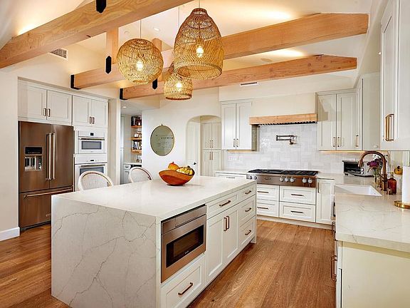 Welcome to this absolutely gorgeous ranch-style home in Rancho Santa Fe Covenant. 4 bedrooms, 3 full baths, 2 half baths and an office. Overflowing with natural light and prioritizing comfort, this home is completely brand new finished in 2022. Beautiful White Oak wide-plank hardwood floors. A gourmet kitchen featuring stunning brass finishes, top-tier appliances from Miele and Calcatta quartz countertops with a statement waterfall island. Spectacular architectural wood beams in the kitchen, dining and living room. This open-concept room has three sets of doors that open up to different outdoor areas: An outdoor kitchen including a BBQ, a drink fridge and a large sink; a lounge pool with a unique island surrounded by canary palms; and an outdoor pool bathroom. Adjacent to the great room are two secondary bedrooms, a spacious bathroom and the primary suite with a relaxing spa-like bathroom boasting a steam shower, large soaking tub and a walk-in closet with built-ins. The primary suite also has large doors that open up to the pool and has views of the garden. On the opposite wing is a large family room which features doors that lead out to the front yard which has been carefully curated to maximize fruit and vegetable bearing trees and plants with a meandering trail. Beyond the family room is a private office that features a library along the back wall and french doors leading to a patio with a private entry. Off the family room is a laundry room and a beautiful guest suite but no built in closet. Oversized two car garage. The tennis court has just been resurfaced and can be a pickleball court, and has a basketball net and lines. The lot is 1.84 acres, and around 1.5 acres is completely fenced and has an electronic entry driveway gate. The home is located within the prestigious Roger Rowe K-8 & Torrey Pines HS district. You will fall in love with the relaxing ambience of this gorgeous home and the serene grounds it sits on. It's the perfect home for hosting and enjoying the laid-back San Diego lifestyle on one of Rancho Santa Fe's most sought-after streets! Rare find!