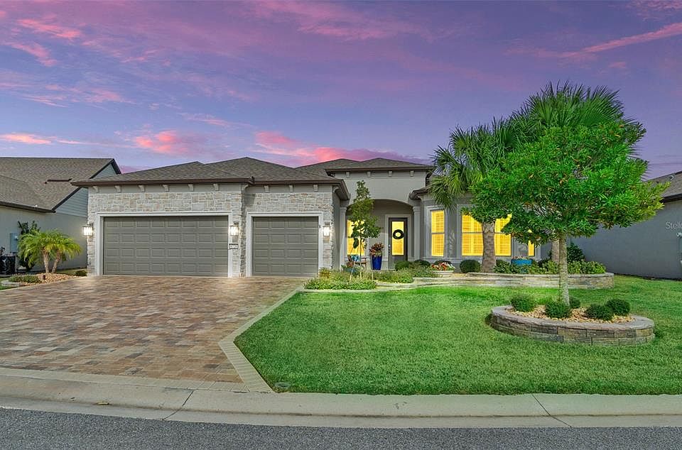 Welcome to this exquisite Stellar model home that boasts 3 bedrooms, 3 bathrooms, a flex room, and a 3-car garage complete with a saltwater pool! The exterior of this home is truly captivating with its driveway pavers, elegant landscape curbing, enchanting outdoor uplighting, and meticulously maintained rock beds. As you step inside, you will be greeted by a charming tongue and groove porch ceiling, a glass front door with a hideaway screen with an inviting open foyer. To the left, you will find a versatile flex room adorned with a coffered tray ceiling, a modern fan, and a stylish tongue and groove wall. The living room is a perfect space for relaxation and entertainment, featuring a coffered tray ceiling, modern fans, an art deco accent wall, floor plug, and breathtaking views of the pool and golf course through the expansive zero corner sliders equipped with custom electric shades. The kitchen is a chef's dream, offering 42" cabinets with pullouts, soft-close drawers, under counter lighting, and upgraded KitchenAid stainless steel appliances. The stunning quartz countertops and the eat-at countertop add a touch of elegance to this culinary haven. The Jr suite bedroom is a haven of comfort for guests, boasting large windows, a spacious closet, and a private bathroom. The third bedroom offers privacy and features large windows, upgraded fan, and a closet with a bathroom in close proximity. The owner's suite is a tranquil retreat filled with natural light streaming through multiple windows. It showcases a tongue and groove wall, coffered tray ceilings, a modern fan, and a generously sized master closet. The owner's suite bathroom is complete with custom mirrors, quartz counters, custom cabinets, and a walk-in shower with a bench. The laundry room is both functional and stylish, featuring a tree hall with drop zone baskets, cabinets, and a sink. The garage is equipped with built-in cabinets, a fridge, a water softener, organizational racks on the wall, and a floor that has been painted with shark coatings. Step outside to the covered lanai, which offers an extended birdcage, pavers, a tongue and groove ceiling, a modern fan, and a saltwater zero entry deep pool with fountains. Additionally, there are two pool heaters (electric & solar), allowing for year-round enjoyment while taking in the picturesque view of the golf course. Throughout the home, you will find additional upgrades such as wood plank tile flooring, plantation shutters, and double crown. Don't let this chance slip away to acquire this home, as it is already equipped with plumbing for an outdoor kitchen and awaits the personalization of its new owners. Schedule a showing by calling today.