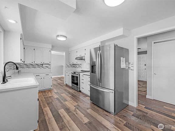 Galley kitchenComposite deckNewer appliancesPark-like fenced backyardVaulted ceilingsGenerous storageFresh paint
