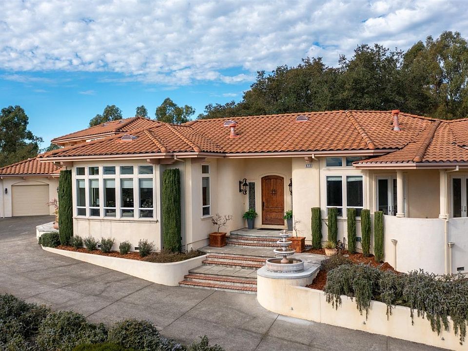 Discover luxurious Wine Country living in this stunning 4-bedroom Mediterranean home with panoramic views on 1.12+/- acres. Grand high ceilings and abundant natural light grace every room of this 4,092+/- sq.ft. residence. The spacious living room boasts a fireplace, gorgeous views and seamlessly merges with the open concept kitchen. The kitchen is outfitted with double ovens, cooktop, large walk-in pantry, and abundant cabinetry. The expansive countertops provide generous workspace. The elegant dining room offers a spacious area to entertain and access to the backyard. The office features a fireplace and French doors to a private balcony. The primary bedroom on the main level boasts luxury amenities, including a fireplace, balcony access, and a spacious bathroom with two vanities, a large tub, shower, and two walk-in closets. An en suite bedroom with backyard access completes the main level. Upstairs, two bedrooms offer captivating views and share a full bathroom. The extra-large 3-car garage provides ample storage. The sprawling backyard, with a patio, garden beds, lush lawn, and level areas, invites endless possibilities. With its unmatched features, central location, excellent floorplan, and situated in a gated community, this home truly offers refinement and tranquility.