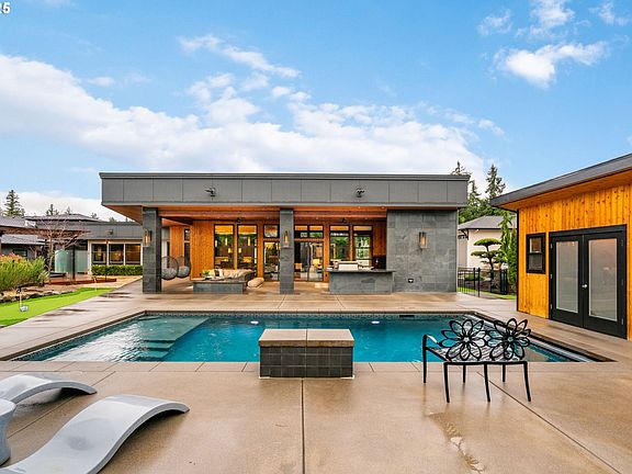 Resort-style poolFlat-roof modern homeOutdoor kitchenSoothing water featureSeparate barBuilt-in dining boothWarm walnut accent walls