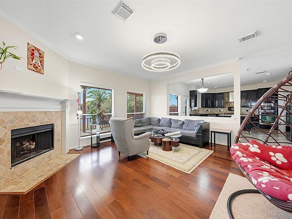 The living room is bright and inviting, featuring large windows that fill the space with natural light. The kitchen boasts custom cabinetry, a spacious island, and stainless steel appliances.