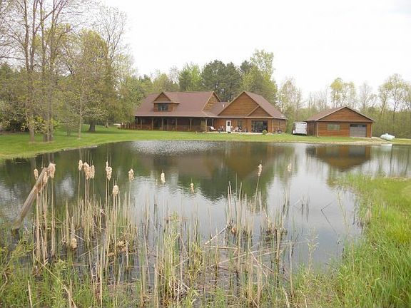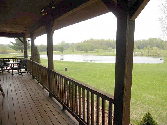 Top quality country 1.5 story home 20 min from GB. 2 ponds over 4 acres. 3.5 attached garage finished with in floor heat above garage plenty of storage with pull down aluminum staircase & additional detached garage 28x34. Home has in floor heat system along with gas FA system. Over 100 ft of covered porch. 1st floor master bedroom & master bath. Custom cedar cabinets. Additional 4.85 acres avail.