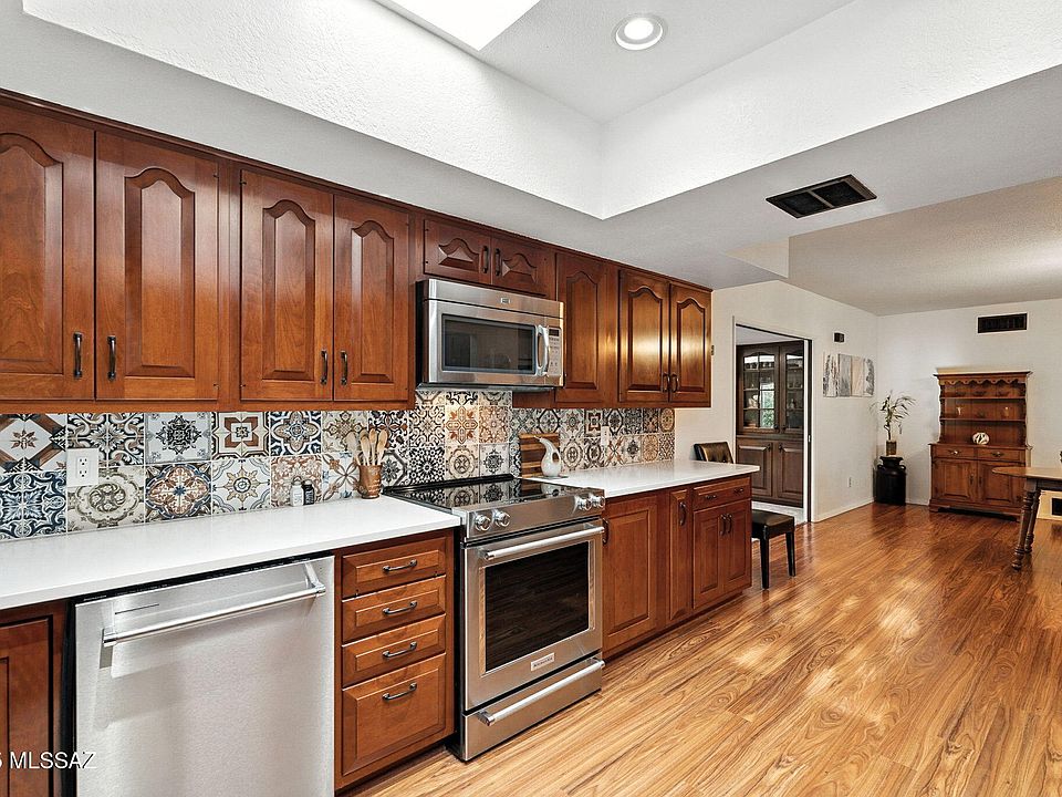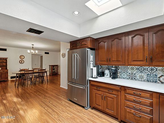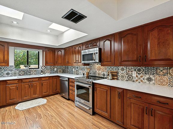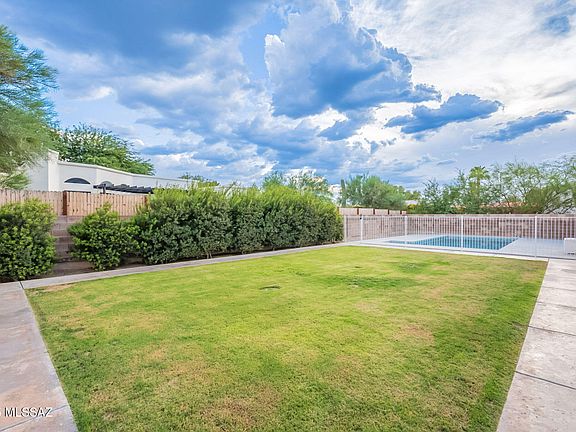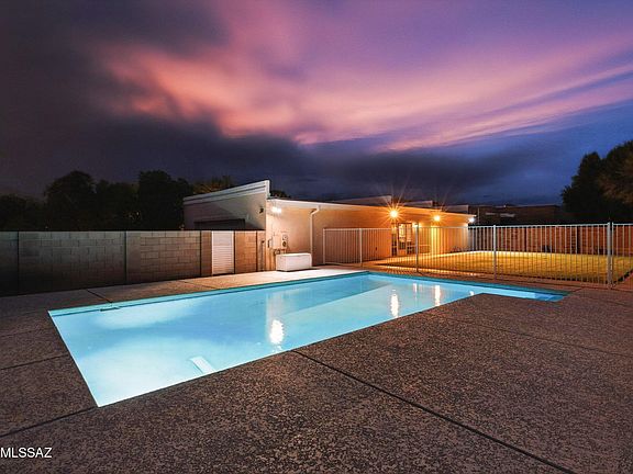 Exceptional home inside the gates of Tucson Country Club! This 2,348 sq ft home offers the perfect blend of space, comfort & family living. Situated on over 1/3 of an acre, the open, light-filled floor plan features laminate wood floors, updated guest baths, recent A/C & water heater, a generous living room w/ brick fireplace & spacious family room flowing from the kitchen that opens to the outdoor private screened retreat. Kitchen boasts quartz counters, cherry cabs and Kitchen Aid stainless appliances. Primary suite w/ updated bath and gorgeous shower. Spacious backyard is made for fun with a newer lap pool w/ real grass lawn. Plenty of parking with a large driveway plus 2-car garage with storage. A rare find on a quiet cul-de-sac in TCC!