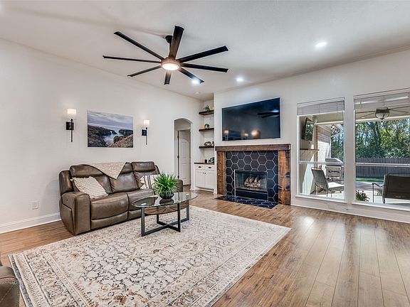 Cozy fireplaceBrick exteriorSerene backyardLush green spaceCovered and extended patioOpen-concept design