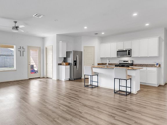 Welcome to this newly built home located in the desirable Springwood neighborhood of Beaumont. Step inside to an inviting open concept layout where the kitchen flows seamlessly into the family room — perfect for entertaining or spontaneous family life. The gourmet kitchen features modern finishes, ample counter space, and an island ideal for meal prep or casual dining. The primary suite is a private retreat, complete with a spa-style en suite bathroom (dual vanities, separate shower, and a generous closet). Two additional bedrooms and a full bath allow flexibility living. Outdoor living is enhanced by a covered patio and a fenced backyard — a great place to relax, host barbecues, or let kids and pets roam safely. Built with energy efficiency in mind, this home is a smart pick for cost-conscious buyers. Located nearby access to major roadways, shopping, dining, & local amenities. Residents enjoy the balance of quiet suburban living with city connectivity.