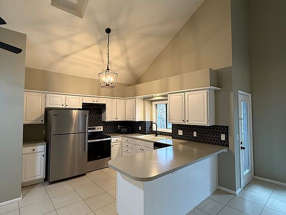 Inside, you'll find updates throughout, including remodeled bathrooms and kitchen, fresh paint, new carpet, and updated lighting. The bright kitchen opens to the living room, which features vaulted ceilings and a cozy fireplace.