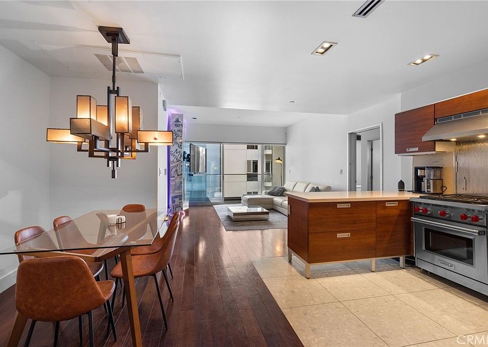The building has 5 floors and ours is the corner condo on the 4th floor positioned well within the interior courtyard with views of the pool & the city lights of Hollywood below. The condo has 2 nice sized bedrooms w/en-suite bathrooms perfect for roommates. The high ceilings, roll up window shades, custom closets, designer light fixtures, custom fireplace, stacked washer dryer, the low pile carpet in the bedrooms/hardwood floors are in great condition. The kitchen is well equipped with state-of the-art appliances & a cool WOLF Range that will make you want to cook. The built-in beverage cooler is nice & the modern European cabinets, drawers finish off the sophisticated feel. To relax after a long day, draw down your shades, turn on the fireplace, set the mood & enjoy your beverage of choice on the balcony overlooking the pool & Hollywood.