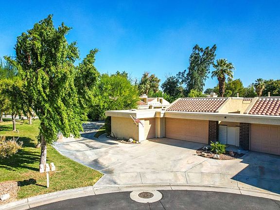 Discover peaceful living in this expansive 3-bed, 2-bath condominium spanning over 2000 sq. ft., one of the largest floor plans in the complex. Nestled on the golf course, you will enjoy stunning Mountain Views from the comfort of your home and from an expansive patio overlooking a tranquil pond. The interiors boast vaulted ceilings, a cozy fireplace, bar, skylights and clerestory windows. This end unit residence on a cul-de-sac with its two-car attached garage, seperate golf cart garage, laundry room and double door entry makes the perfect blend of sophistication, ease and natural beauty. Your Palm Springs home awaits, embrace a lifestyle of comfort in this roomy residence and lush, guard gated community.