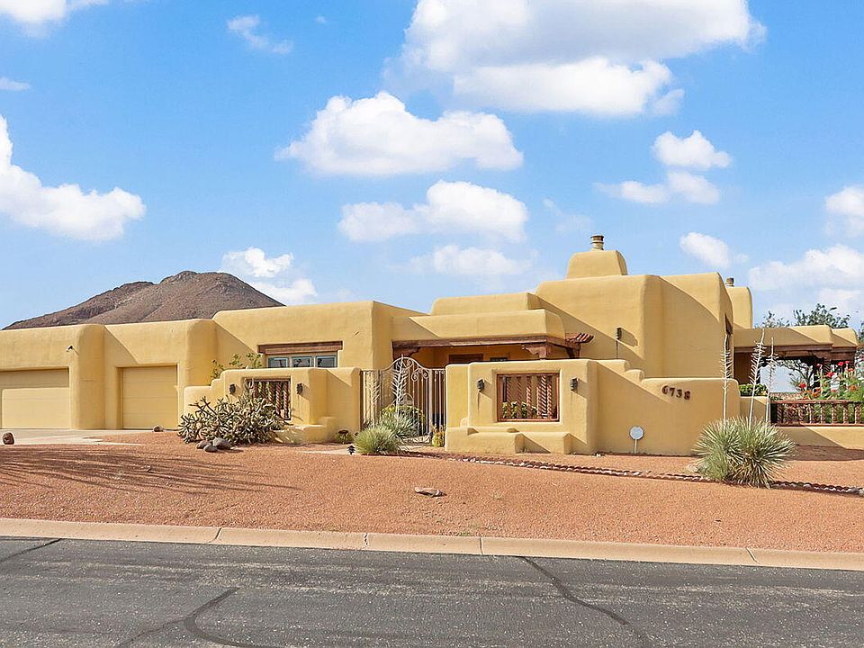 Beautiful Picacho Hills home punctuated with stunning panoramic views located in the tranquil gated community of Butterfield Ridge. The 3,450 Sq. ft. Southwestern style home features 3 BR, 2.5 BA, massive great room, carved wooden beams and decorative wood features throughout. Large picture windows showcase the beauty of the area and fill the home with natural light allowing for a spectacular view from every window. The custom kitchen has a large island, Corian countertops, paneled appliances, generous number of cabinets and large pantry. The spacious main bedroom has a cozy kiva like corner fireplace, and the spa-like ensuite has a jetted tub, generous shower and large walk-in closet. You then step outside to a resort-style backyard featuring a large, covered patio perfect for entertaining family and friends!