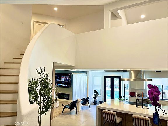 Inside, the chef's kitchen is sleek, open, and fully stocked with all modern necessities. High ceilings, ambient lighting, and a grand piano beside the built-in bar create a sophisticated, grand-modern vibe. Modern conveniences such as washer and dryer, TVs, fireplace, and furniture are included.